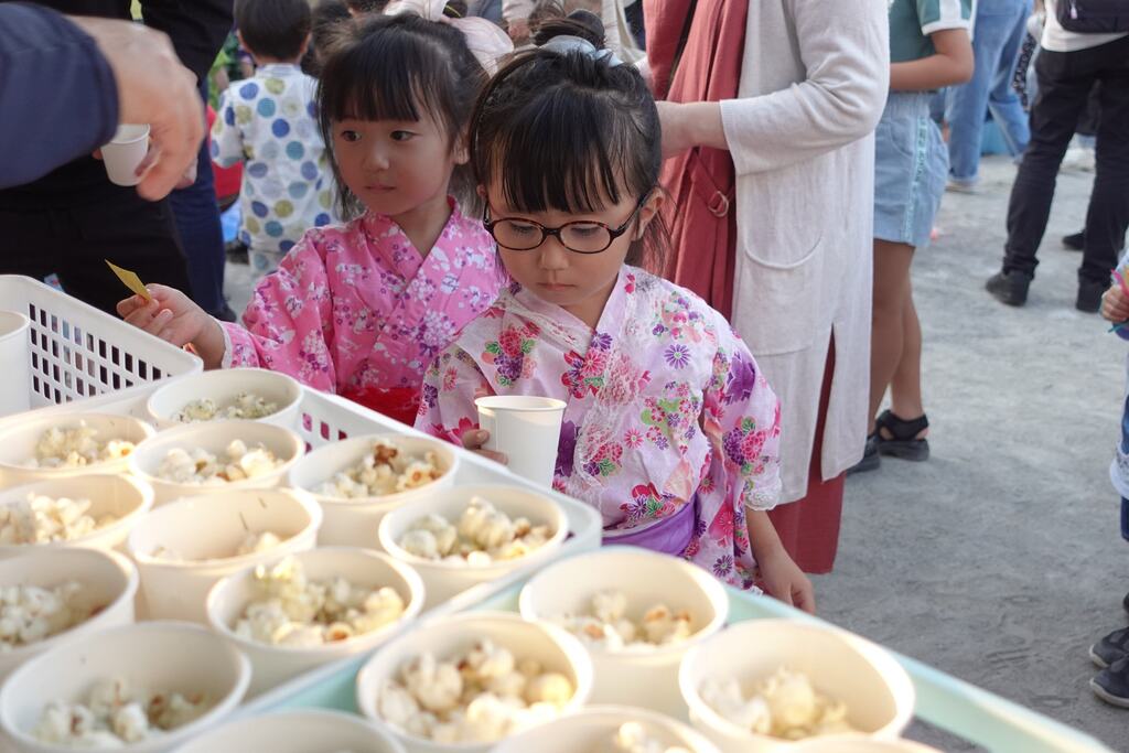 アトラクションを楽しんだ後は、給食室特製の食ブースでひと休み。今年は寒天とポップコーンを用意。懐かしい味わいに「おいしい!」と声があがり、大好評でした。