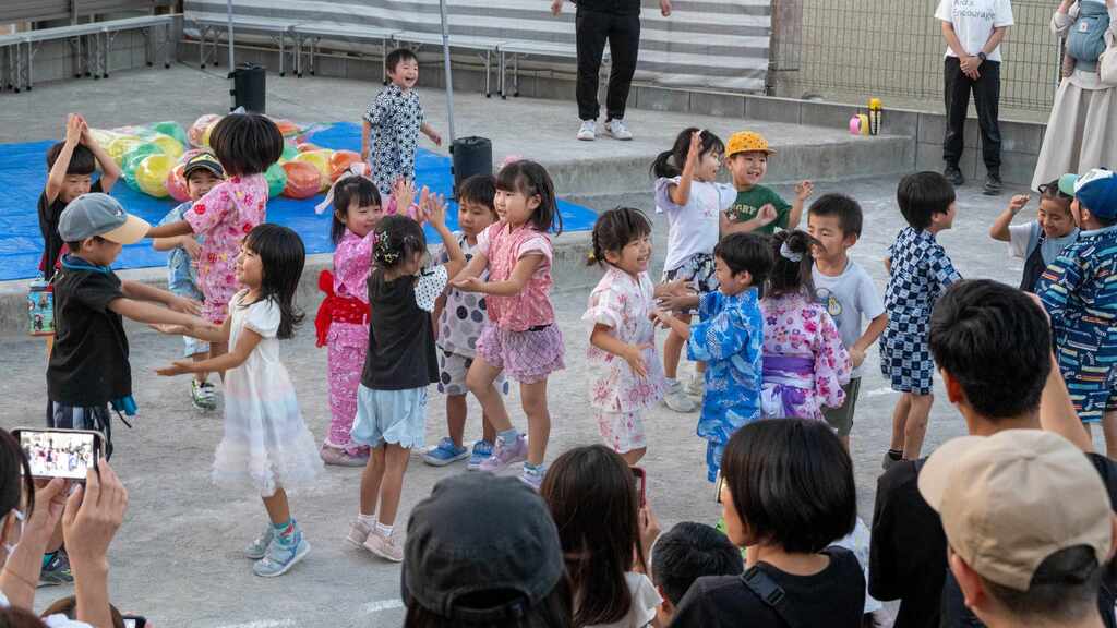 今年は夕暮れ時の開催となり、自然の演出も加わって特別なひとときとなりました。ご参加いただいた皆さま、ありがとうございました。子どもたちは今も遊びの中で「お祭りごっこ」を楽しんでいます。