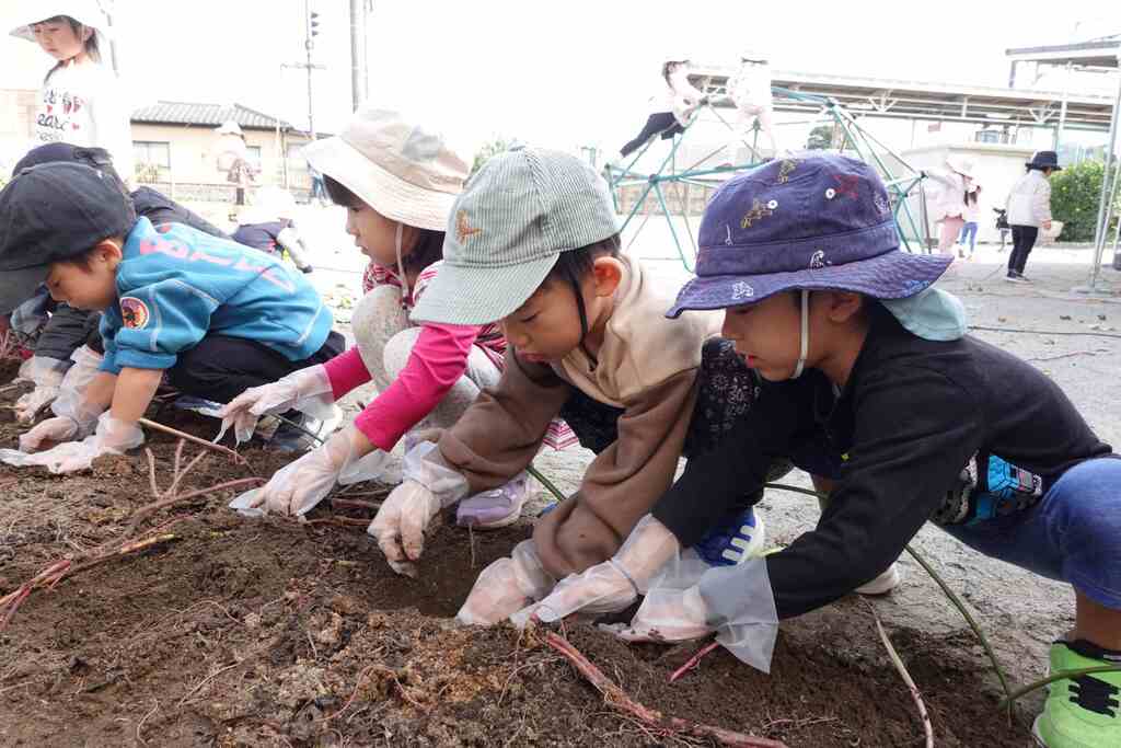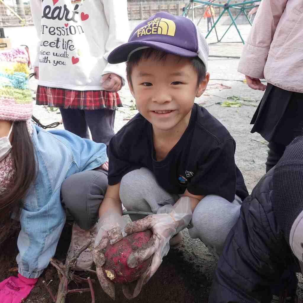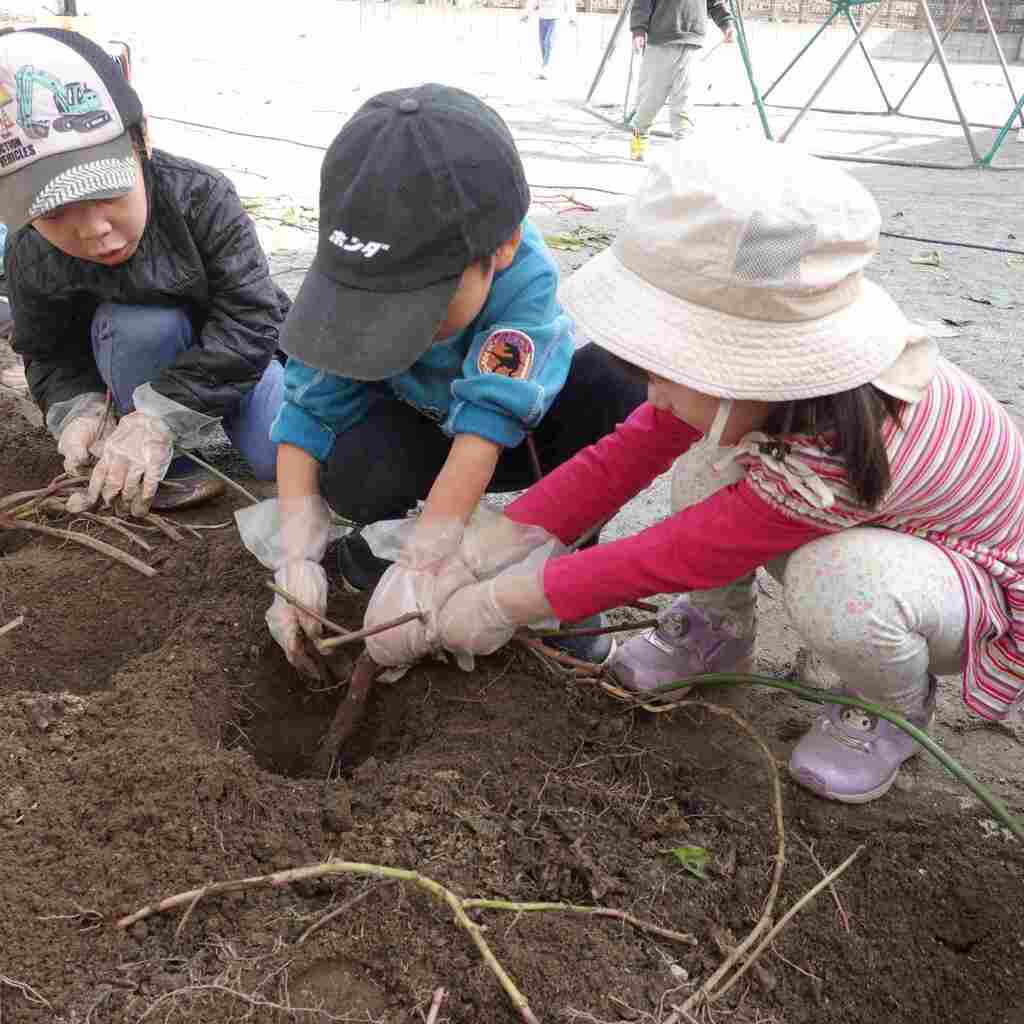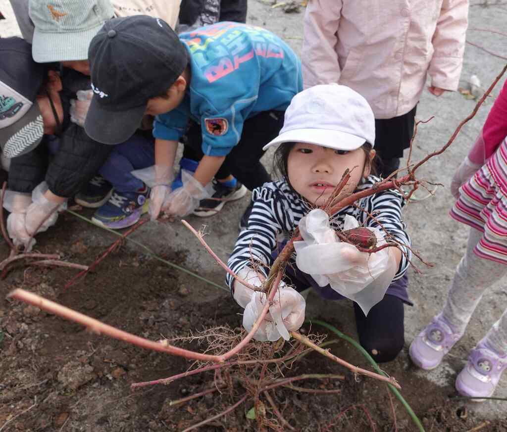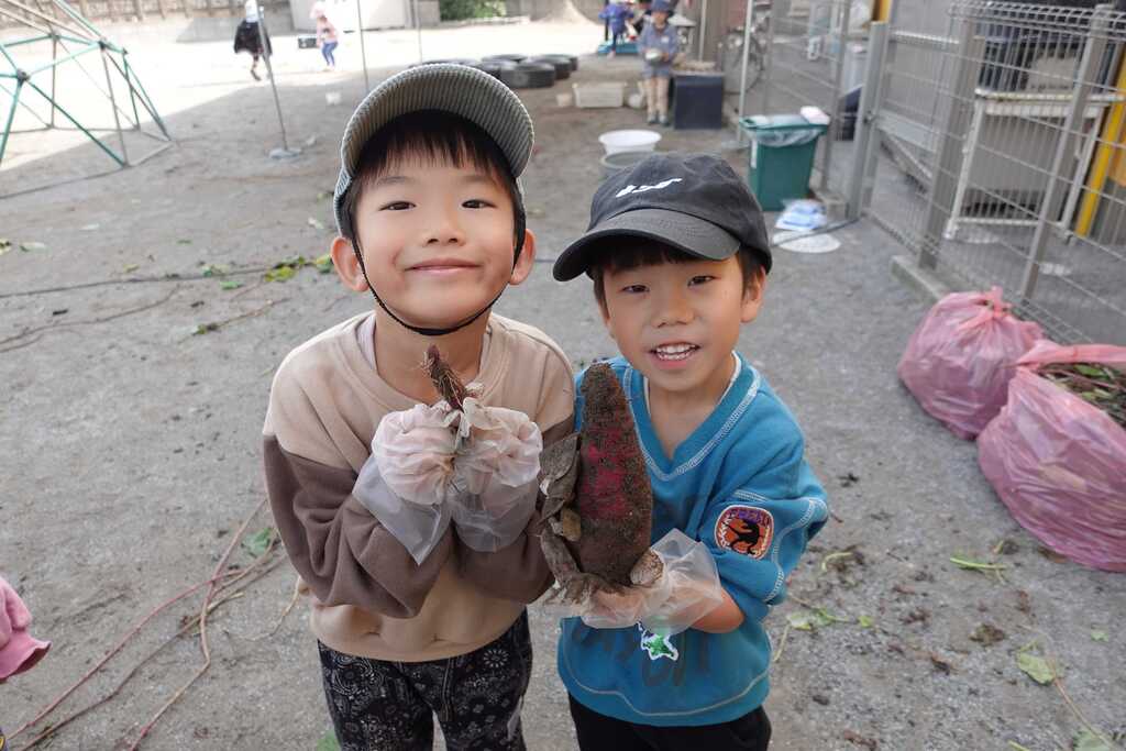 今年のお芋は不作で、残念ながら大小全部集めても20個弱しか採れませんでした。それでもあきらめない子ども達。「うんとこしょ!」と言いながら数人で引っ張ってみたり、深く掘ってみたりしながら探していました。