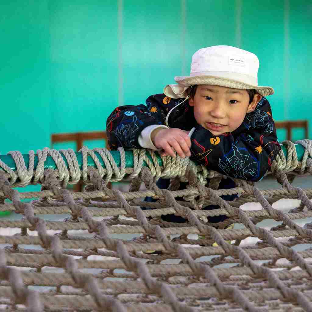4歳児は、手足をしっかり使って慎重に網を渡ったり、低い場所では全力で駆けのぼったりと、自分の力で「やってみよう」と挑戦する姿がたくさん見られました。そして、さすがは年長さん。一番高いところまでスイスイ登り、友だちとタイミングを合わせて滑り降りるなど、共有する楽しさを存分に味わっていました。