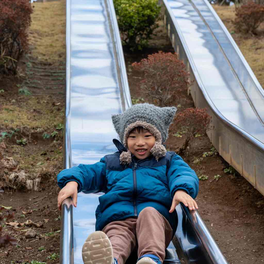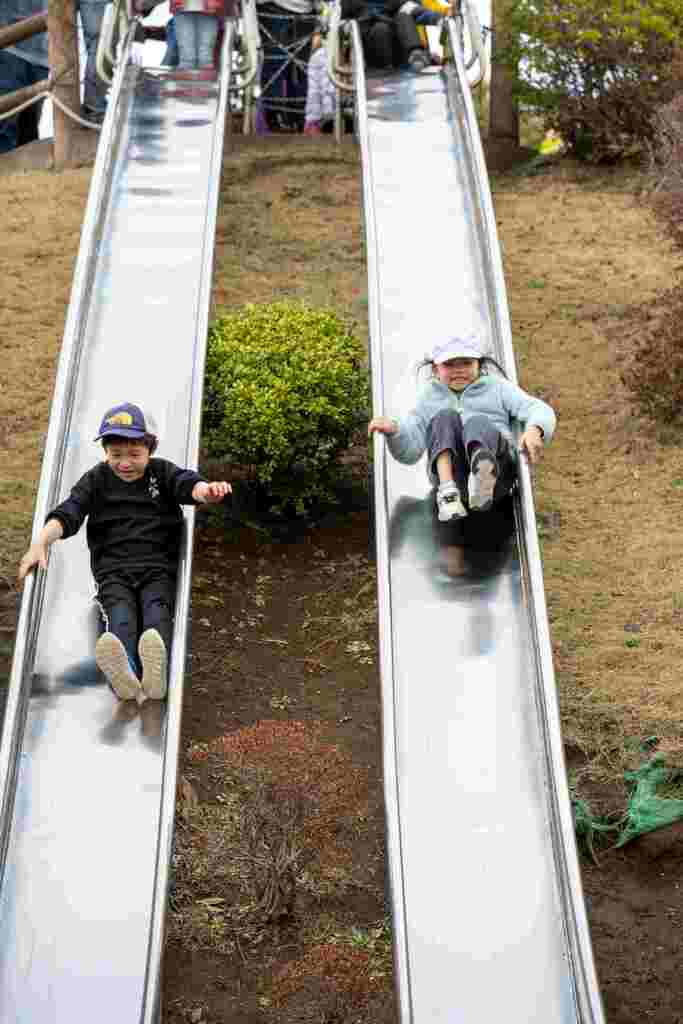 汽車を降りたら、お待ちかねのスリル満点の高い滑り台へ。かなりの高さに驚くかと思いきや、子どもたちは元気いっぱい階段を駆け上がり、勢いよく滑り降りたり、自分でスピードを調節したりと、どの子も夢中になって楽しんでいました。